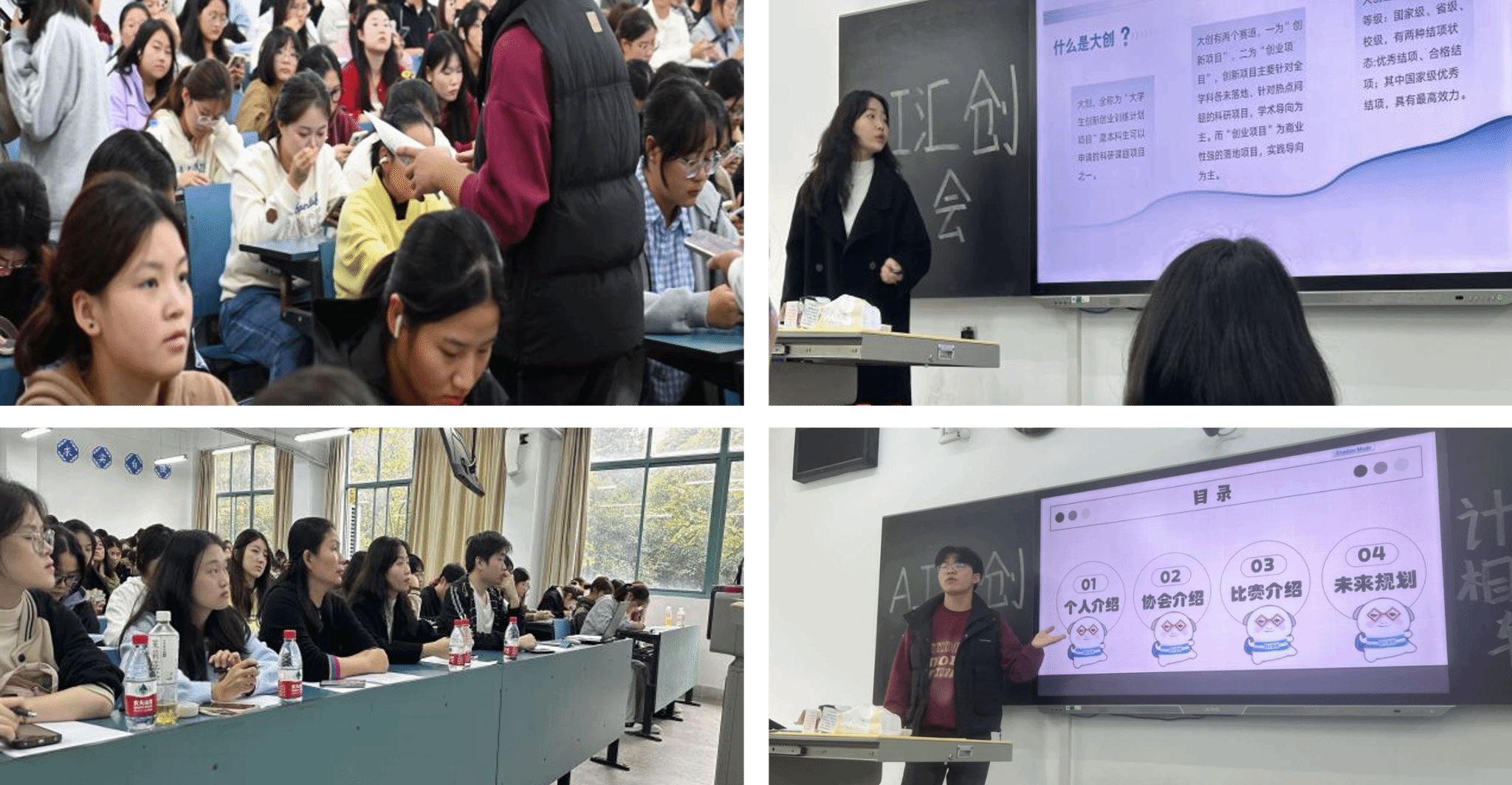 会议伊始,协会会长彭卫佳同学首先对本协会的各部门进行了详细介绍,并以案例介绍的形式将计算机相关竞赛进行了解读,让会员们对计算机相关竞赛有了更加全面的了解。协会副会长闵佳慧同学向会员们介绍了大创项目的申报和科研竞赛的备赛程序,并结合自己的申请经验和备赛心得对同学们的疑问进行了详细解答。最后,协会指导老师张铭老师重点为大家介绍了老员工创新大赛和“挑战杯”竞赛的相关注意事项,鼓励大家围绕医学研究的热点、难点及备赛要求积极参加。同时,她还强调了坚持和专注在科研中的重要性,鼓励大家要勇于面对困难和挑战,不断提升自己的科研素养和实践能力,为科研创新贡献自己的力量。