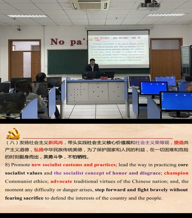 以读促学,让文字“滋养心灵”。外语党支部开展双语《中国共产党章程》学习活动。中英文结合的党章诵读学习,创新性地将政治学习与外语专业结合,极大调动了党员的学习积极性,激发了党员教师们的学习热情,营造了良好的学习氛围,促进党员用理论武装大脑,进一步增强政治自觉、提高政治站位、加强党性修养。