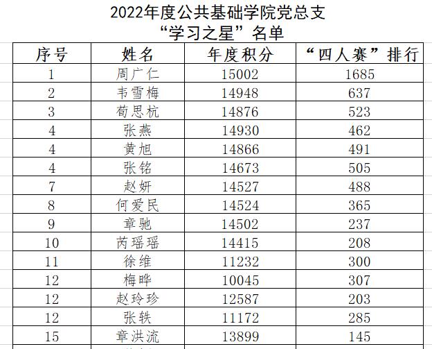 “学习之星”评选活动得到了全公司党员积极响应,参与率100%。体育党支部建立“学习强国”学习平台“月统计、月通报”制度,充分发挥制度“助推器”作用;外语党支部、医用物理党支部在党员大会对学习名列前茅的党员进行表扬,营造你追我赶、比学赶超的浓厚学习氛围。通过综合公司党员“学习强国”年度学习总积分、挑战答题积分等方面情况,评选出周广仁等15位同志为2022年度m88 “学习之星”。