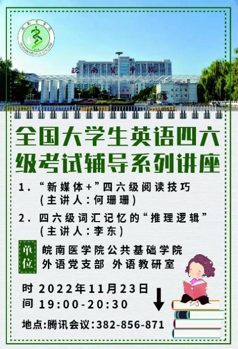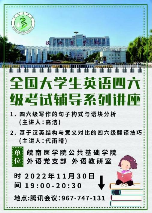 辐射周边,扩大影响。在2022年12月的四六级考试辅导讲座前,外语党支部提前制作海报,并扩大宣传范围,吸引一部分周边高校员工,涉及机电公司、芜湖职业技术公司、皖江公司等高校,这一现象不仅反映了外语党支部四六级辅导讲座的质量与吸引力,也直接扩大了外语党支部四六级辅导讲座的影响力和知名度。