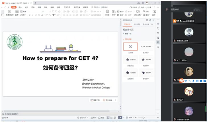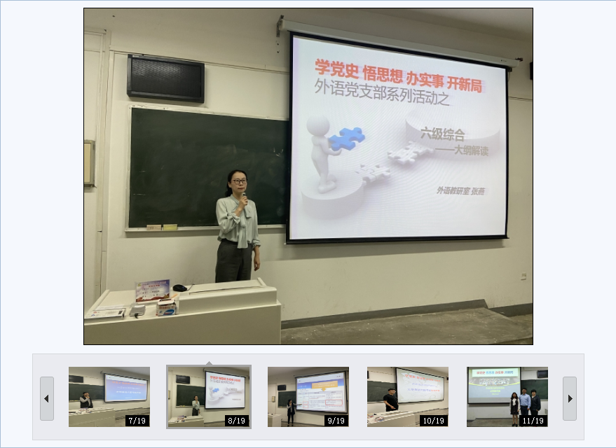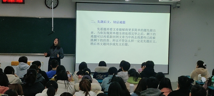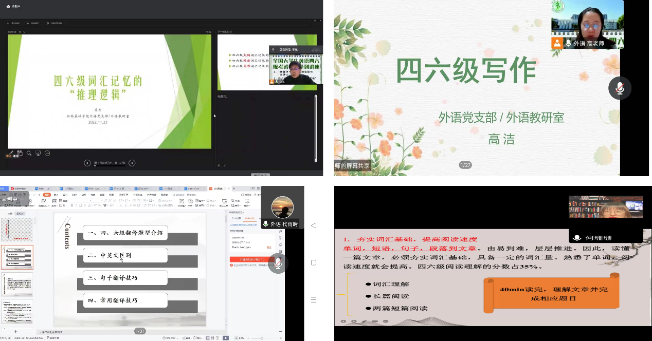 近三年来,考虑到新教学方式的普及和疫情影响,外语党支部采取线上线下混合式辅导,组织形式相对灵活,力保四六级辅导持续、高效开展。2021年5月,外语党支部组织全体党员教师在南北校区举办8场线下四六级辅导讲座,对四六级考纲、听力、阅读、翻译、写作、口语专项复习和答题技巧等话题进行分类明确的模块化讲解。