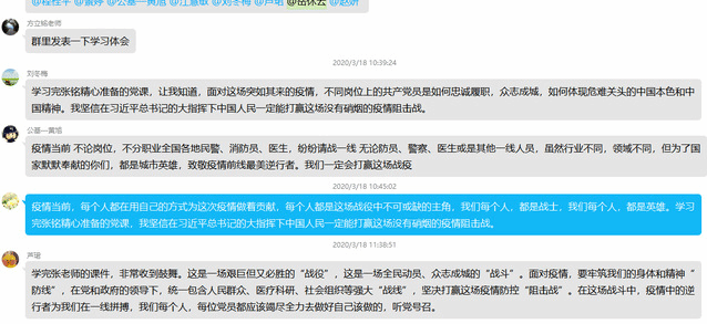 党员刘冬梅说:学习完张铭精心准备的党课,让我知道,面对这场突如其来的疫情,不同岗位上的共产党员是如何忠诚履职,众志成城,如何体现危难关头的中国本色和中国精神。我坚信在习近平总书记的统一指挥下中国人民一定能打赢这场没有硝烟的疫情阻击战。