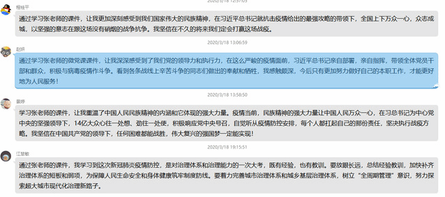 参会人员在线上交流了在预防和抗击疫情中自己的认识和体会。支部书记方立铭认为,张铭老师的这次党课,我受益匪浅,最难忘的是那一幕幕“最美逆行者”们带来的感动。这是一场没有硝烟的战争。危急关头,无论是医护人员、基层工作者,还是基层一线党员干部,都化身为英勇的逆行者无私无畏地伫立在我们与病魔之间,用坚守和奉献甚至是牺牲支撑起生命的绿色通道,他们是这个时代最可爱的人。哪有什么岁月静好,只是有人替我们负重前行而已。作为祖国分母中的一个分子,我感受到了在中国共产党的坚强领导下,全国人民同呼吸、共命运、心连心的中国力量,这是我们战胜疫情的最大底气。没有一个冬天不会过去,没有一个春天不会来临。相信在我们的共同努力下,中国一定能打赢这场防疫攻坚战!武汉加油!中国加油!