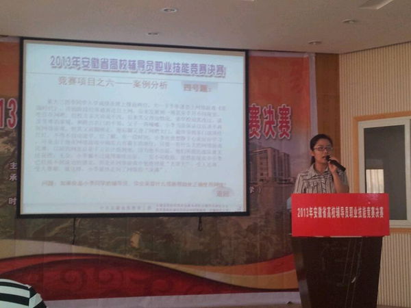 2013年5月22日-23日,2013年安徽省高校辅导员职业技能竞赛决赛在安徽师范大学举行。本次比赛由中共安徽省委教育工委主办、安徽省高校思想政治教育研究会辅导员研究分会、教育部高校辅导员培训和研修基地(安徽师范大学)承办。经过复赛选拔,来自全省26所本科公司和高职高专院校的30名选手晋级决赛。公司选派的医学一系辅导员汪楠楠老师以总分第四的成绩获得一等奖。