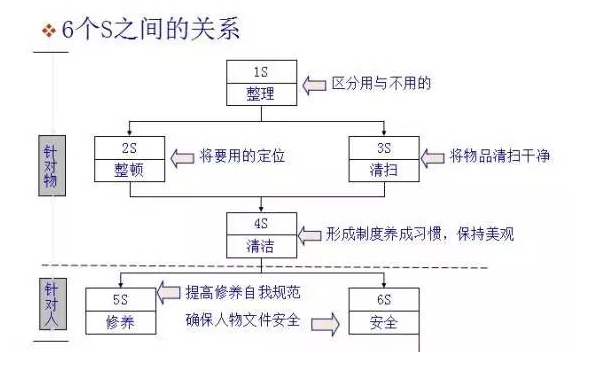 6S起源于日本。所谓6S是指对实验、实训、办公生产现场各运用要素(主要是物的要素)所处状态不断进行整理、整顿、清扫、清洁、提高素养及安全的活动。