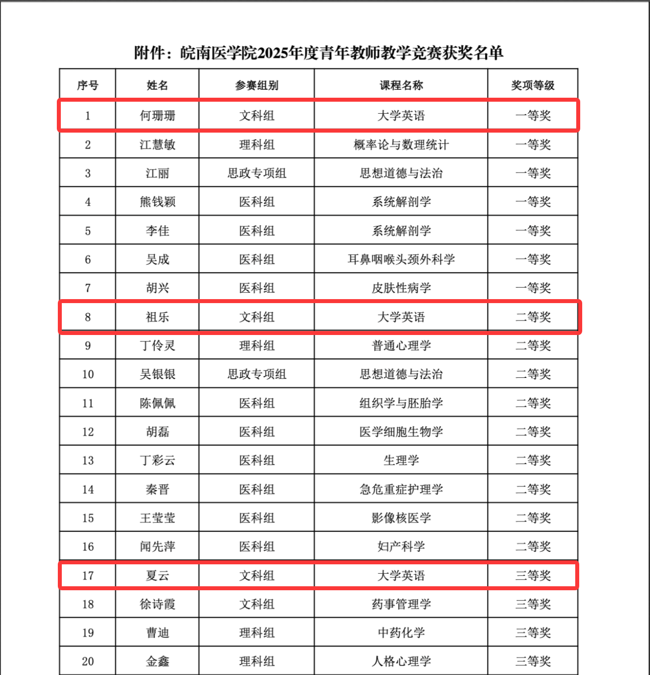 获奖名单