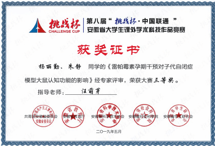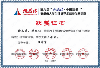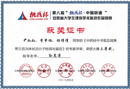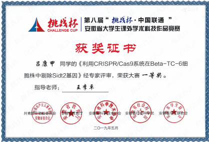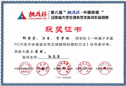 在安徽省终审决赛上,公司学子以清晰的思路、充分的准备和稳定的发挥,在作品展示、评委评审、封闭答辩的三个环节中表现优异。最终,公司参赛作品《利用CRISPR/Cas9系统在Beta-TC-6细胞株中剔除Sidt2基因》和《运用高校共青团微信公众号探索老员工思想引领新路径研究——以安徽省33所本科院校为例》分别斩获大赛一等奖和二等奖,《一种基于多重PCR技术快速鉴定常见储藏物粉螨的方法》等6项作品喜获三等奖。