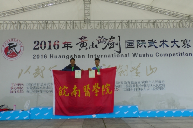 2016年“黄山论剑”国际武术大赛由国家体育总局武术运动管理中心、中国武术协会、安徽省体育局、黄山市人民政府共同主办, 2016年11月14日至17日在中国安徽省黄山市体育馆举行,为期4天,有来自境外37个国家和地区及全国20个省市61支队伍近800名运动员,参加传统拳术、太极拳、南拳、单器械、长器械、短器械等项目的比赛。“黄山论剑”高手如云,面对专业选手,闫俊翔同学在吴寿枝、郭雷祥两位教练指导下稳扎稳打,用实力取得了1金1铜的骄人成绩。